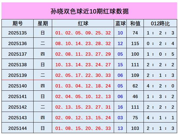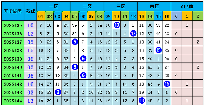 上期总结:双色球第2025144期开出奖号:红球01、08、15、20、26、33;蓝球13,其中红球和值为103,012路比为2:1:3,奇偶比3:3,蓝球开出大奇数号码13。