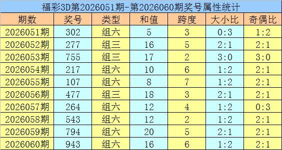 开奖总结:福彩3D第2026060期开出奖号943。奖号方式为组六天津紫日电气科技有限公司,奇偶比为2:1,012路比为2:1:0,大小比为1:2,和值为16,跨度为6。